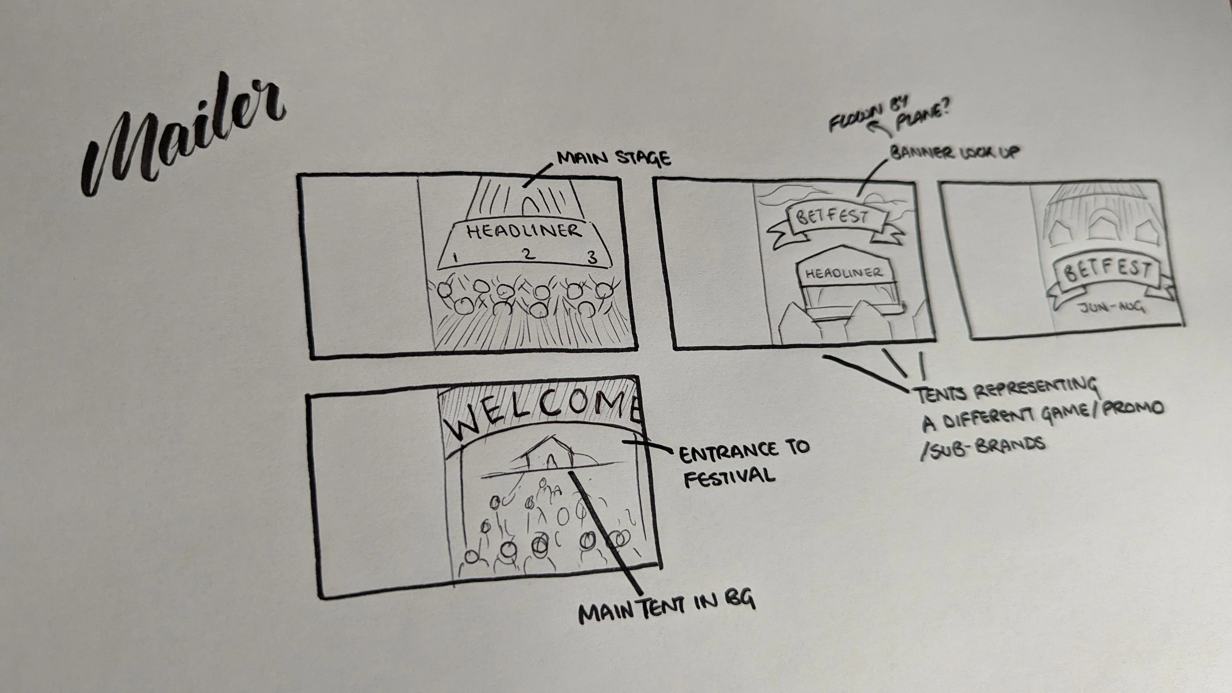 After sending out the ticket invitation, the visual concept we developed focused on the inside of a festival-style tent for the subsequent mailers, creating a series of hero images to correspond with the theme of each weekly promotion.